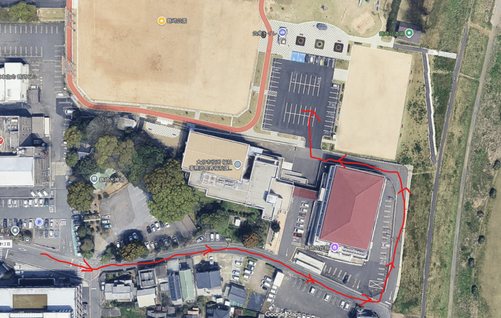 鶴崎支所から土手際まですすむと、会場すぐ横の駐車場にいけます。